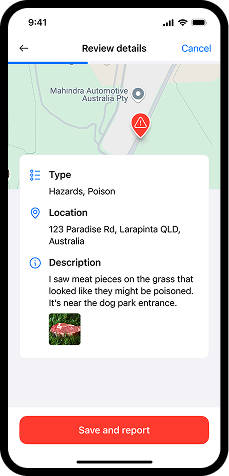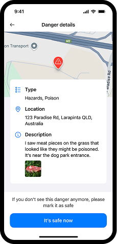 Wenn Sie unterwegs sind und etwas Gefährliches entdecken – wie Rattengift, zerbrochenes Glas, aggressive Hunde oder sogar ein freilaufendes Tier – können Sie dies direkt in der App melden.