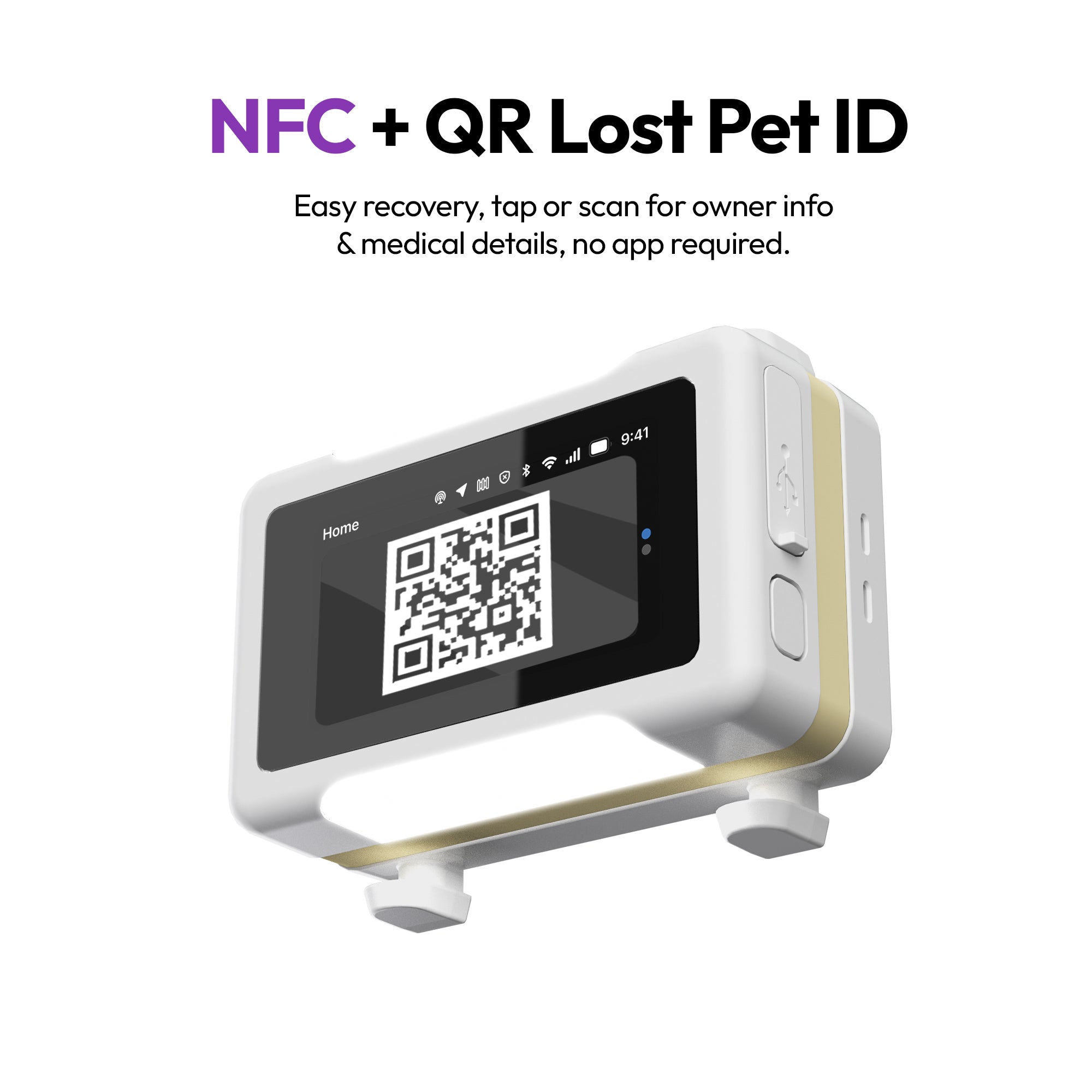 - 🖥️ 触摸屏显示 + 丢失宠物 ID: TFT 屏幕显示实时健康数据、二维码 ID 码和警报。双 NFC + QR 恢复确保任何人都可以安全地归还您的宠物——无需应用程序。