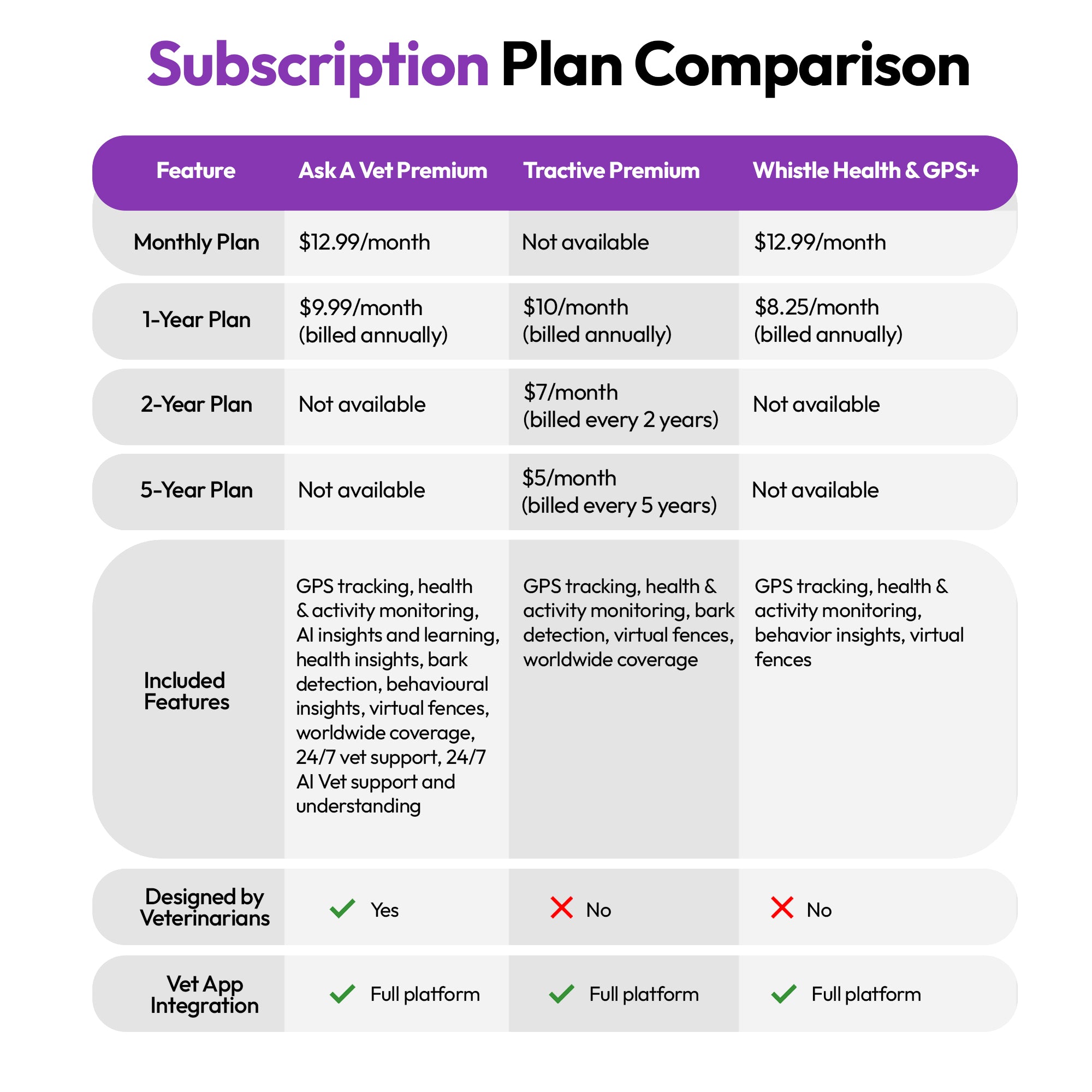 所有计划均包括无限的个人资料更新、安全的联系方式共享、兽医信息存储、扫描通知和失宠物恢复工具。