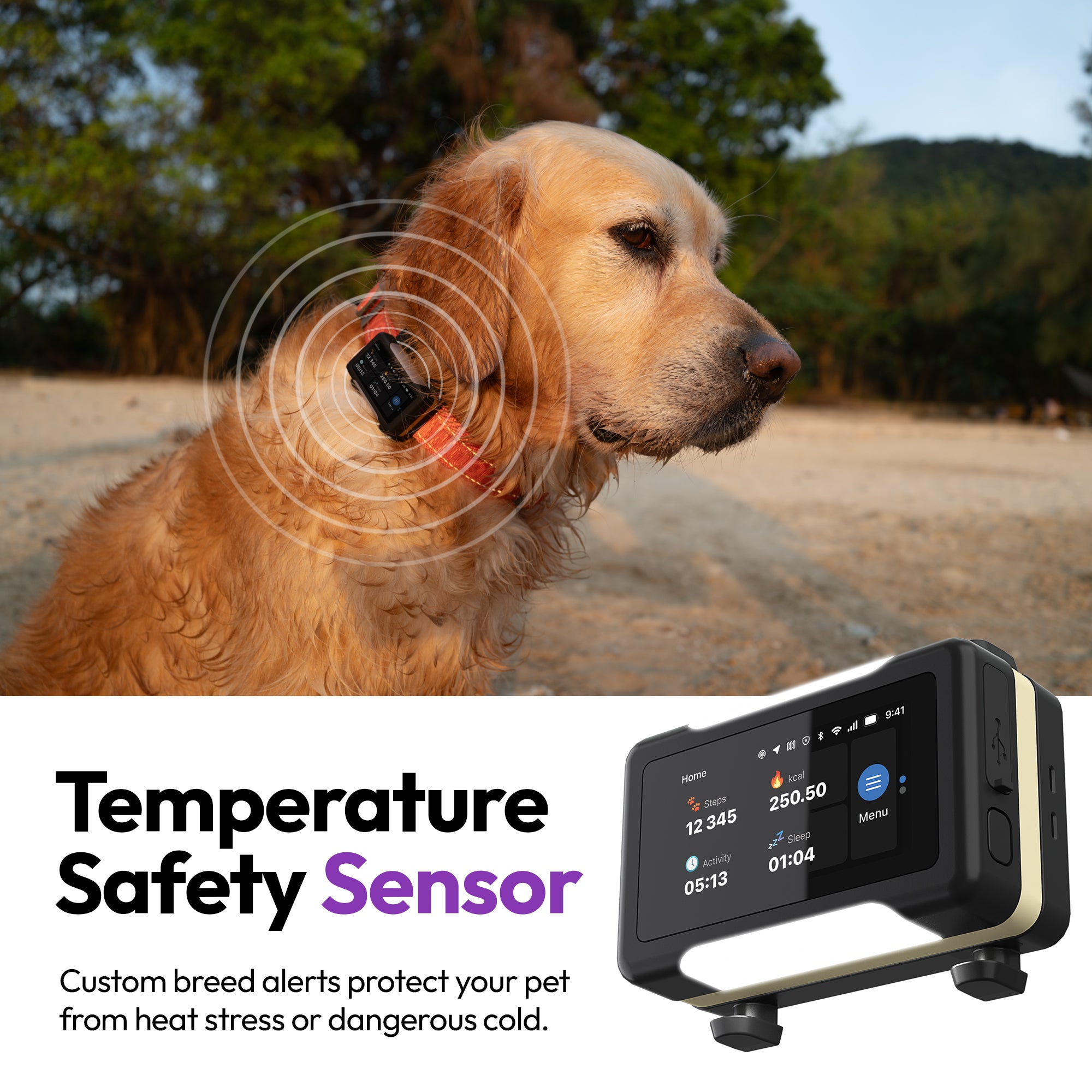 - 📍 实时 GPS + 虚拟围栏: 使用 4G/LTE + UWB 精确追踪您的宠物。设置可自定义的安全区域,并提供即时逃逸警报以确保最大安全性。