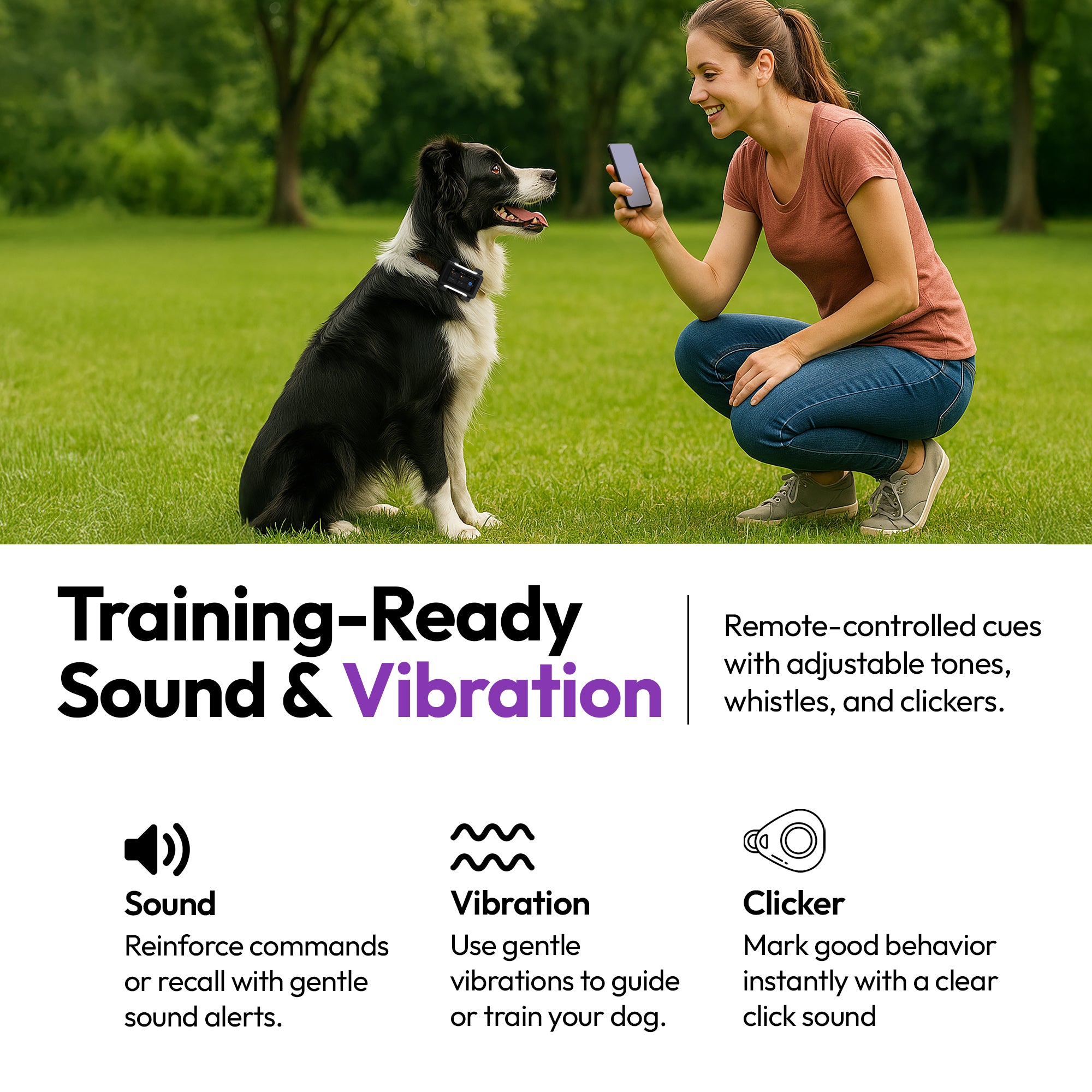- 🔊 行为检测 + 训练工具: AI 吠叫检测、焦虑警报,以及内置声音/振动提示用于训练。通过 Ask A Vet 应用程序远程强化指令。